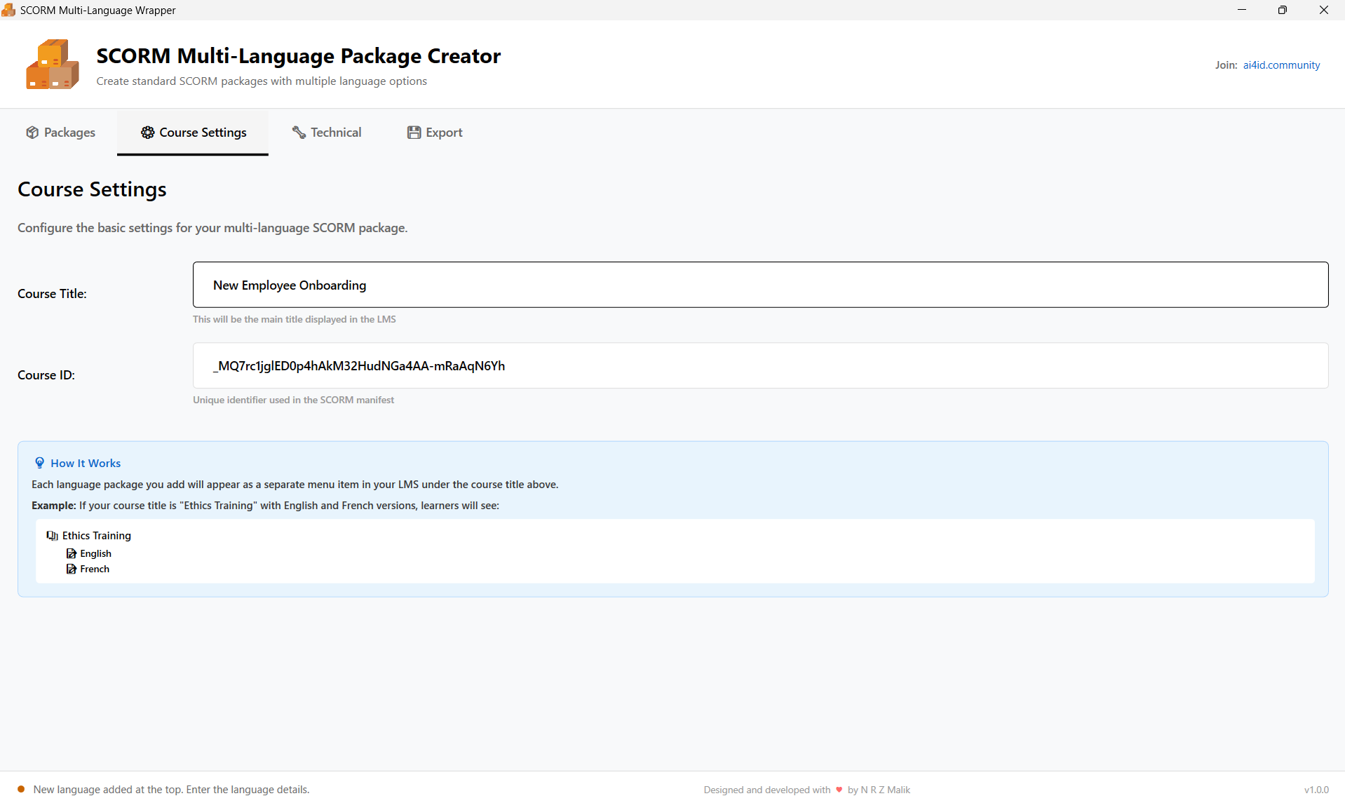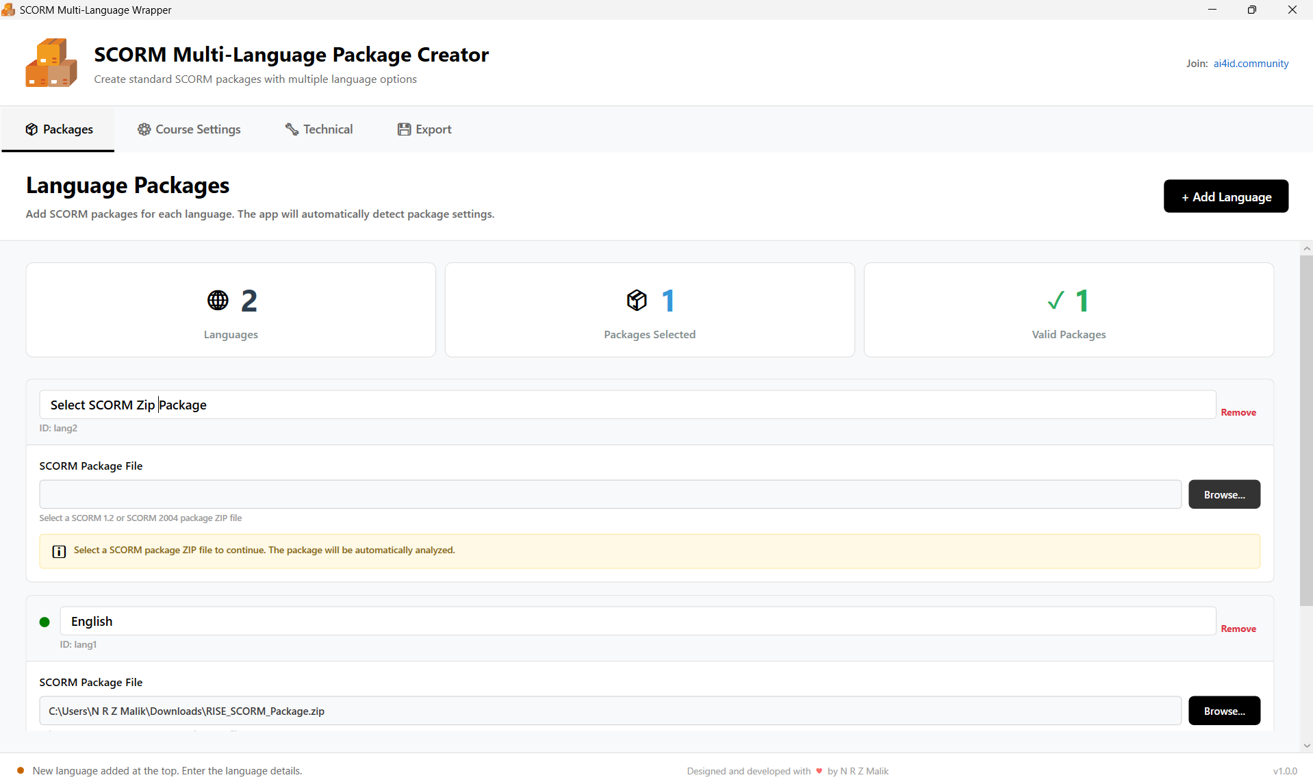 Select your existing SCORM packages for each language. The app automatically detects package information.