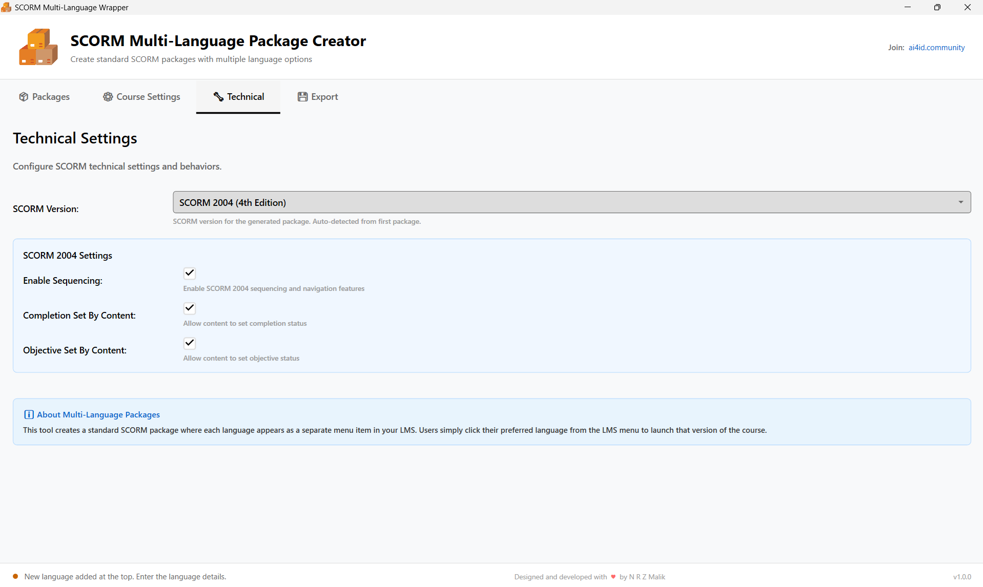 Professional Windows desktop application designed for eLearning content creators. Package your courses in multiple languages with SCORM 1.2 and SCORM 2004 support.
